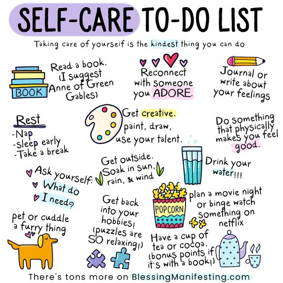 Self-care can also refer to activities that an individual engages in to relax and attain emotional well-being, such as meditating, journaling, or visiting a counselor.